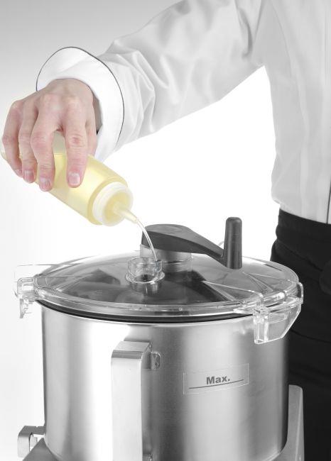 Ergonomia i kontrola pracy pokrywa z wysoce odpornego poliwęglanu z otworem z korkiem pozwalającym na dodawanie składników podczas pracy urządzenia