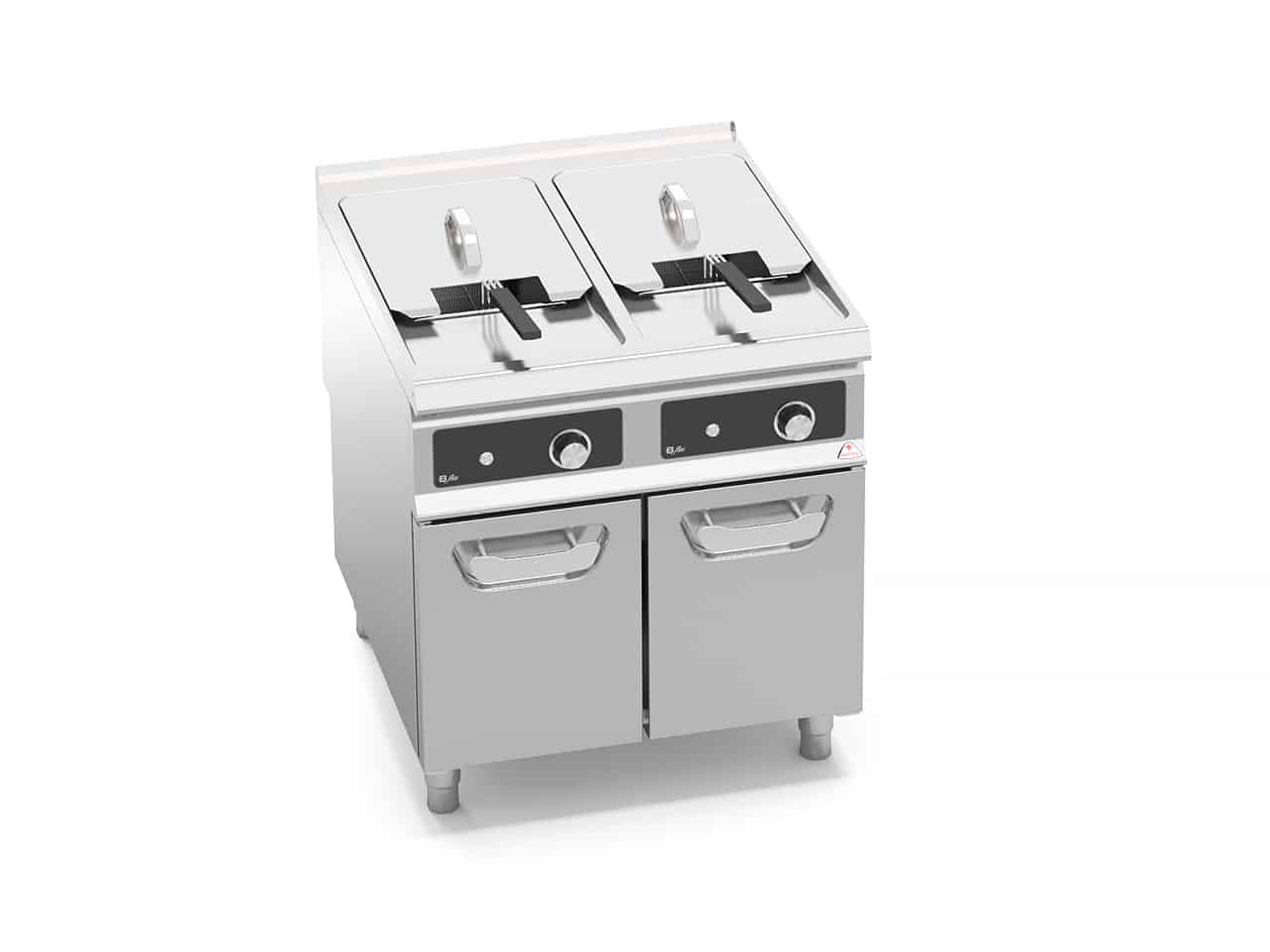 Powierzchnia robocza ze stali nierdzewnej inox AISI 304 o grubości 20/10, panele przednie i boczne ze stali nierdzewnej inox AISI 304, wykończenie typu Scotch Brite. Rezystancje ze stali nierdzewnej inox incoloy, umieszczone bezpośrednio wewnątrz zbiornika i przechylane w pozycji pionowej dla łatwego czyszczenia. Urządzenie awaryjne odcinające zasilanie elektryczne w przypadku rezystancji ustawionych w pozycji pionowej. Kontrola temperatury przy pomocy elektrycznego termostatu wysokiej precyzji. Zbiornik ze stali nierdzewnej inox AISI 304 o szerokich zaokrąglonych narożnikach oraz szerokiej strefie chłodnej, pod palnikami, do dekantacji pozostałości. Płaszczyzna z zaokrąglonymi obrzeżami zawiera w sobie powierzchnię dla opierania koszy, która jest lekko nachylona w celu łatwiejszego odpływu oleju. Dwa osobne zbiorniki z oddzielnymi poleceniami, zapewniające niezależną i optymalną regulację temperatury. Kulowy kranik odprowadzający, umieszczony wewnątrz zbiornika, sterowany za pomocą rączki z obudową odporną na ciepło, stalowa miseczka zbiorcza.