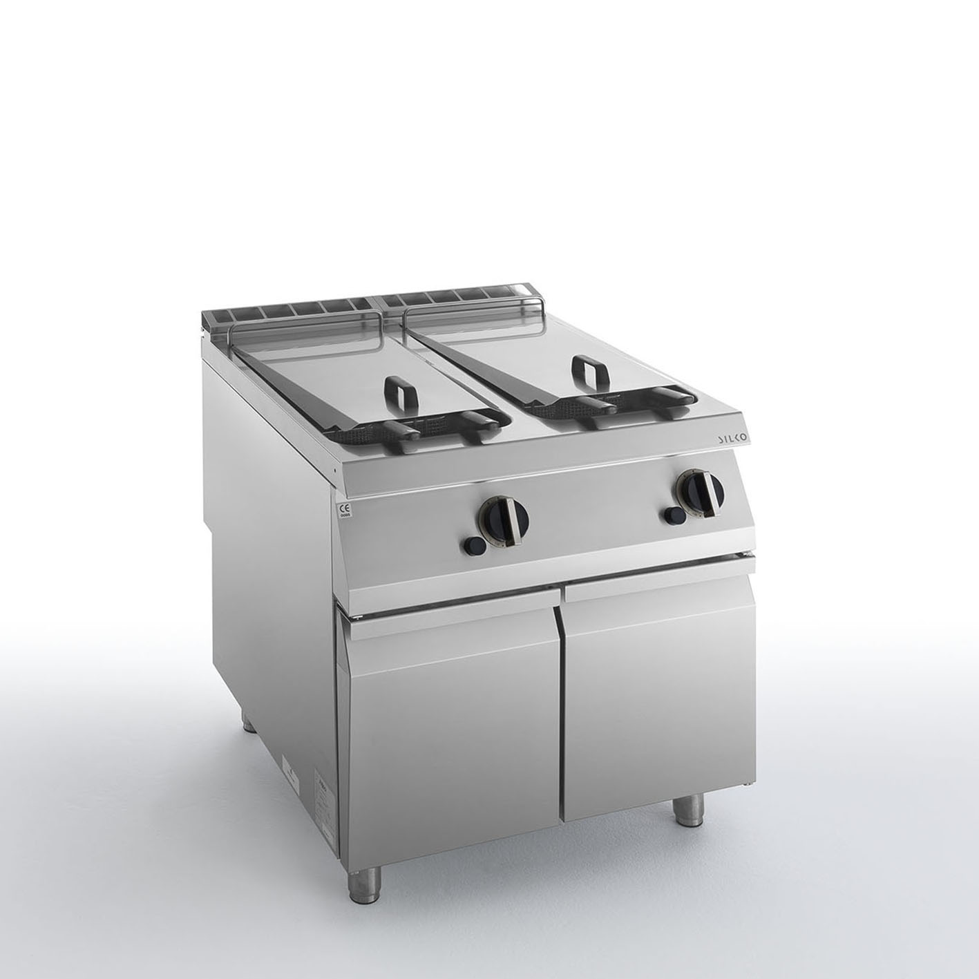 Frytownica gazowa, podwójna komora, jednostka monoblokowa na szafce z drzwiami na zawiasach. Blat ze stali nierdzewnej (AISI 304) o grubości 20/10, wstępnie zamontowany do połączenia głowica-głowica. Tłoczone komory wykonane ze stali nierdzewnej AISI 304, z zaokrąglonym profilem wewnętrznym. Pojemność studni w litrach 15+15. Studnie z szerokim obszarem rozprężania w przedniej części dla oleju i piany oraz rozszerzonym obszarem chłodzenia w przedniej części do zbierania cząstek żywności. Ogrzewanie za pomocą palników ze stali nierdzewnej ze zoptymalizowanym płomieniem umieszczonym na zewnątrz komory. Regulacja ciepła za pomocą termostatycznego zaworu bezpieczeństwa z termoparą. Zapłon palnika głównego za pomocą palnika pilotowego. Piezoelektryczny zapłon z wodoodporną nasadką na panelu sterowania. Temperatura oleju wewnątrz szybu regulowana za pomocą termostatu mechanicznego w zakresie od 100 do 185 °C. Ręcznie resetowany termostat bezpieczeństwa. W zestawie wyjmowany filtr, kosz i pokrywa oraz kolektor do kurka spustowego. Nóżki ze stali nierdzewnej o regulowanej wysokości.
