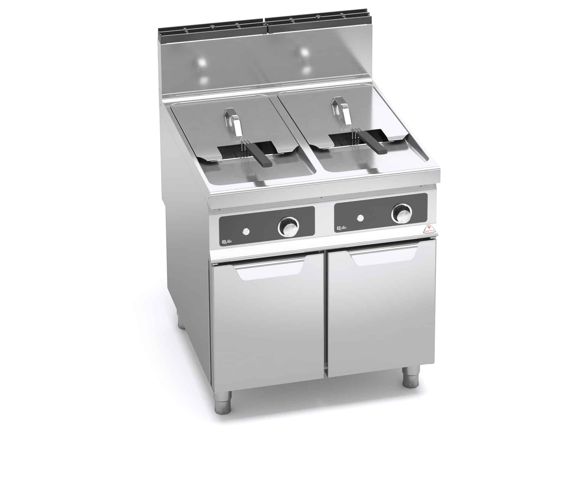 Płaszczyzna robocza, panele przednie oraz boczne wykonane ze stali nierdzewnej inox AISI 304. Wnętrze ze stali nierdzewnej. Rurowe palniki ze stali nierdzewnej, w formie piastra miodu. Wymienniki ciepła o przekroju owalnym i o dużej powierzchni, umieszczone bezpośrednio wewnątrz dużych zbiorników, zapewniają szybkie i jednolite podgrzewanie. Płomień pilotujący oraz zawór awaryjny w termoparze. Piezoelektryczny zapłon w gumową osłoną. Zbiorniki ze stali nierdzewnej AISI 304 z szerokimi zaokrąglonymi obrzeżami oraz obszerną częścią chłodną umieszczoną pod palnikami i służącą do zbierania pozostałości potraw. Płaszczyzna robocza z zaokrąglonymi obrzeżami, powierzchnia do stawiania koszy lekko pochylona i ułatwiająca odpływ oleju. Kontrola temperatury za pomocą termostatycznego zaworu o zakresie od 110°C do 190°C, z dokładnym pomiarem dzięki czujnikom umieszczonym wewnątrz zbiorników. Termostat awaryjny uzbrajany ręcznie. Kulkowy zawór odpływowy umieszczony wewnątrz zagłębienia, sterowany za pomocą rączki odpornej na ciepło oraz stalowy pojemnik zbiorczy.