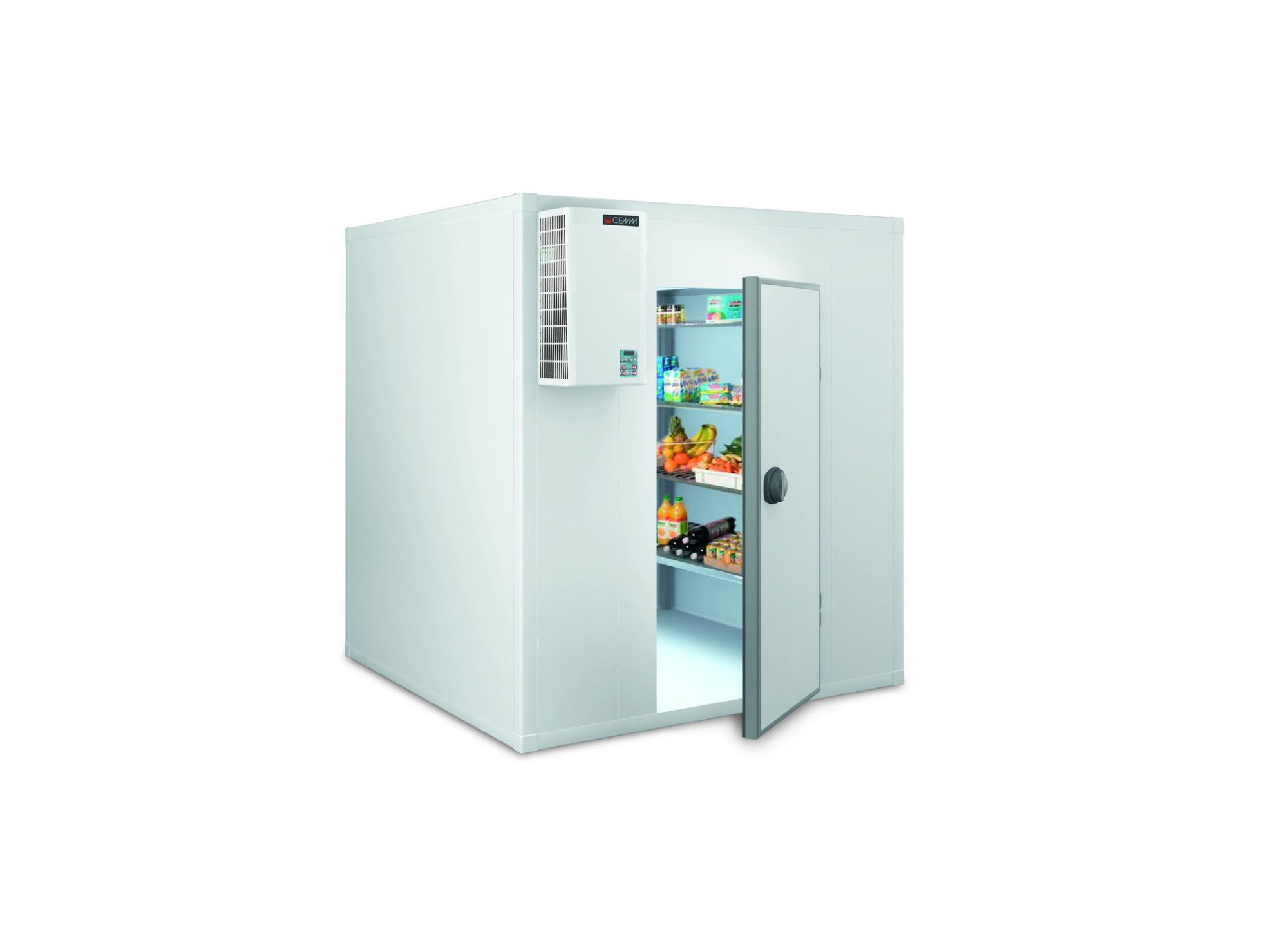 Modułowe chłodnie GEMM IGLOO zostały zaprojektowane tak, aby zagwarantować szybki, łatwy i bezbłędny montaż. Panele warstwowe z wykończeniem blachy wewnętrznej i zewnętrznej w kolorze białym. Izolacja w piance poliuretanowej ( PUR ) o gęstości 43 kg / m3 i grubości 60, 80 i 100 mm, na życzenie 120 i 140 mm. Montaż za pomocą systemu blokowania męsko-żeńskiego i specjalnie zaprojektowanych sworzni łączących, aby zapewnić łatwość montażu i idealne wyrównanie wszystkich elementów. Uszczelnienie między panelami gwarantowane przez specjalne uszczelki obwodowe z rozszerzonego polietylenu montowane podczas procedury pienienia. Nasza standardowa podłoga jest wykończona szarą antypoślizgową blachą pokrytą tworzywem sztucznym i izolowana poliuretanem o gęstości 43 kg / m3 ( PUR ). Drzwi o takim samym wykończeniu jak standardowe panele mają ramę z otworem 80/90 x 190h cm, aluminiowe ościeżnicę, profil, zawiasy z regulacją wysokości wykonane z materiału kompozytowego, zewnętrzny uchwyt z blokadą klucza i wewnętrzny uchwyt. Drzwi do komór mroźniczych są standardowo dostarczane z elektrycznymi grzałkami antykondensacyjnymi umieszczonymi w aluminiowej rurze wstępnie spienionej wewnątrz ramy. Na życzenie mogą być dostarczone drzwi przesuwne z ręcznym lub automatycznym otwieraniem. Wszystkie nasze monoblokowe agregaty chłodnicze są montowane na panelach bocznych, na dachu komory, lub są to wersje split do zdalnych instalacji. Agregaty mają wysoką wydajność i niski poziom hałasu. Półki wewnętrzne dostępne na życzenie, z perforowanymi półkami o głębokości 400, 500 lub 600 mm, wykonane w całości ze stali nierdzewnej AISI 304 18/10 lub ramy aluminiowej i półek polipropylenowych.