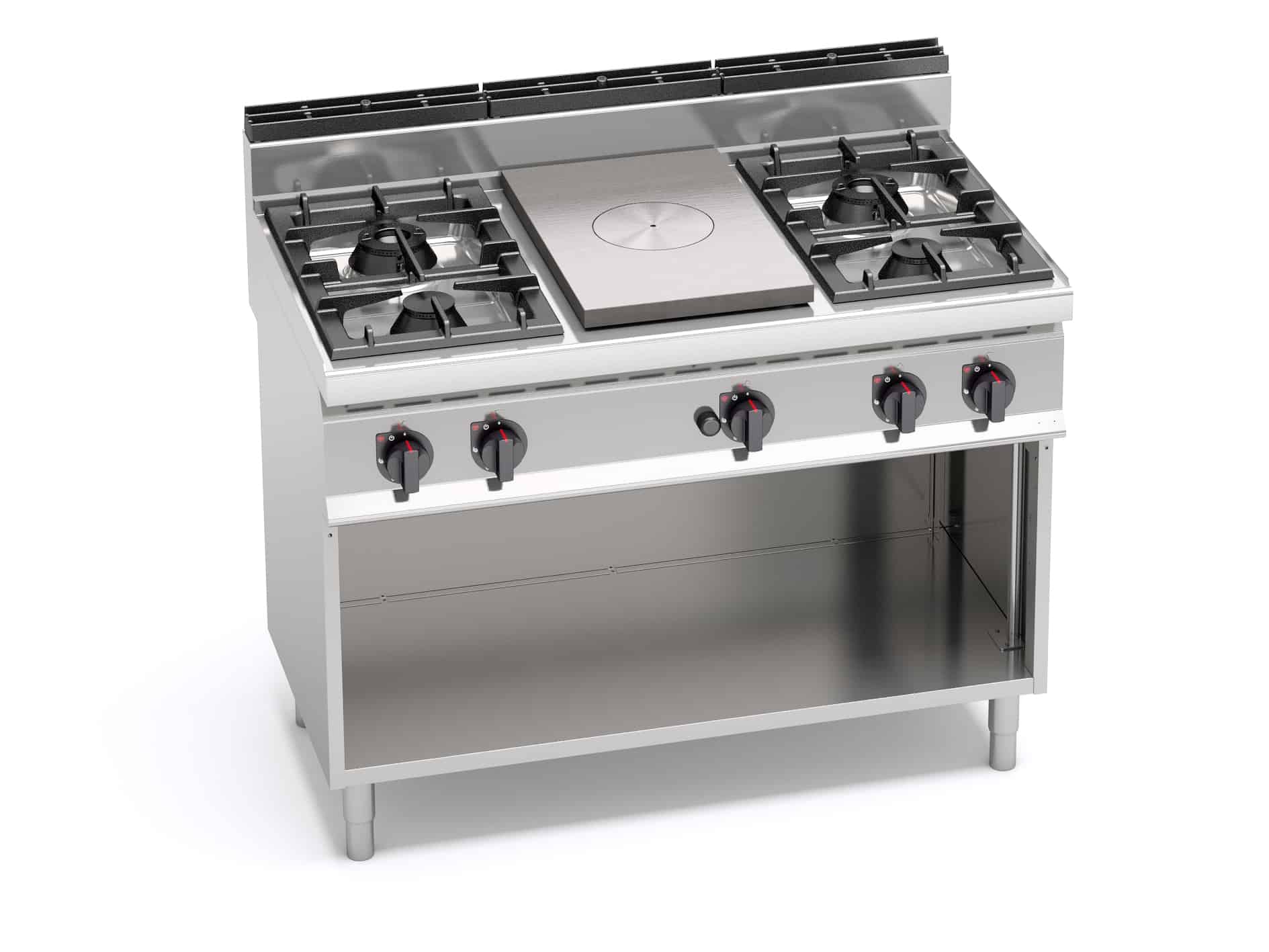 Płaszczyzna robocza i panele przednie wykonane ze stali nierdzewnej inox AISI 304. Płyta ze stali o dużej grubości, z wysokim stopniem rezystancji oraz dystrybucją ciepła w zrόżnicowanych strefach termicznych: maksymalna temperatura w centrum, malejąca w kierunku obrzeży. Centralny palnik o mocy 7 kW , posiadający zoptymalizowany system spalania, uruchamiany pokrętłem zaworowym z termoparą awaryjną oraz osłonięta kontrolka płomienia. Piezoelektryczny zapłon z silikonową osłoną. Palniki otwartego płomienia wykonane całkowicie z niklowanego żeliwa, z pojedynczą lub podwόjną koroną i o dużej mocy, posiadające płomień pilotujący, z dożywotnią gwarancją, uruchamiane pokrętłem zaworowym z termoparą awaryjną i osłoniętą kontrolką płomienia. Kratki żeliwne. Możliwość całkowitego wyciągnięcia zarόwno trzonu palnika jak i miski umożliwia zachowanie maksymalnej czystości i konserwacji. Nόżki nastawne (wersja z obudową).