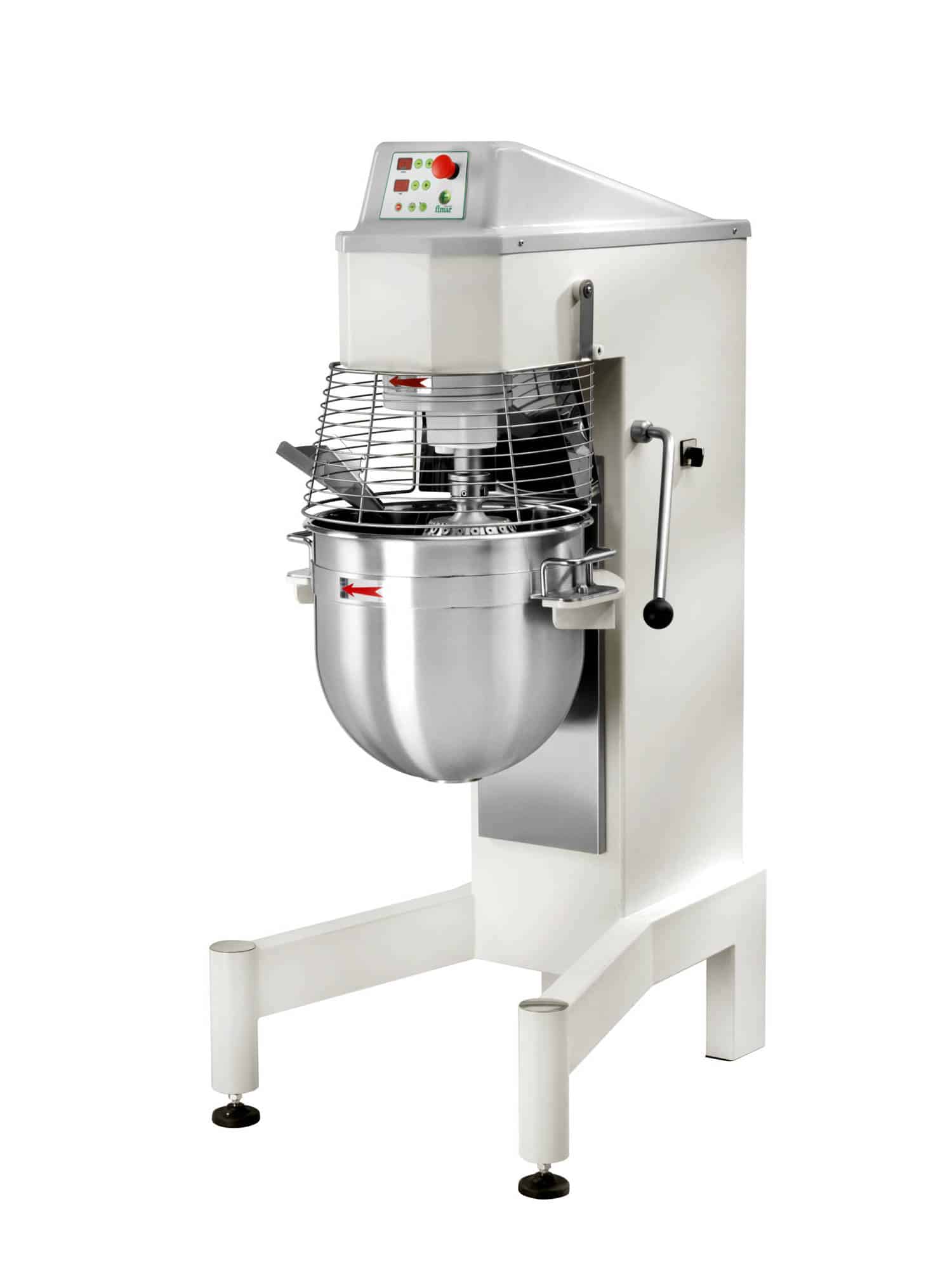 Mikser planetarny z wariatorem prędkości i cyfrowym sterowaniem. Maszyna do różnych rodzajów ciast, takich jak pizza, pieczywo, herbatniki, rogaliki, bułeczki, ptysie, biszkopty, ciasta kruche, bezy, przeciery, różne sosy, bita śmietana, itp. Rama pokryta farbą odporną na zarysowania – górna obudowa z ABS – miska, bicz i osłona miski ze stali nierdzewnej AISI 304 – hak i szpatułka z aluminium – mikroprzełącznik na misce i osłonie miski – wyjmowana misa – szybkie podłączenie narzędzia.
