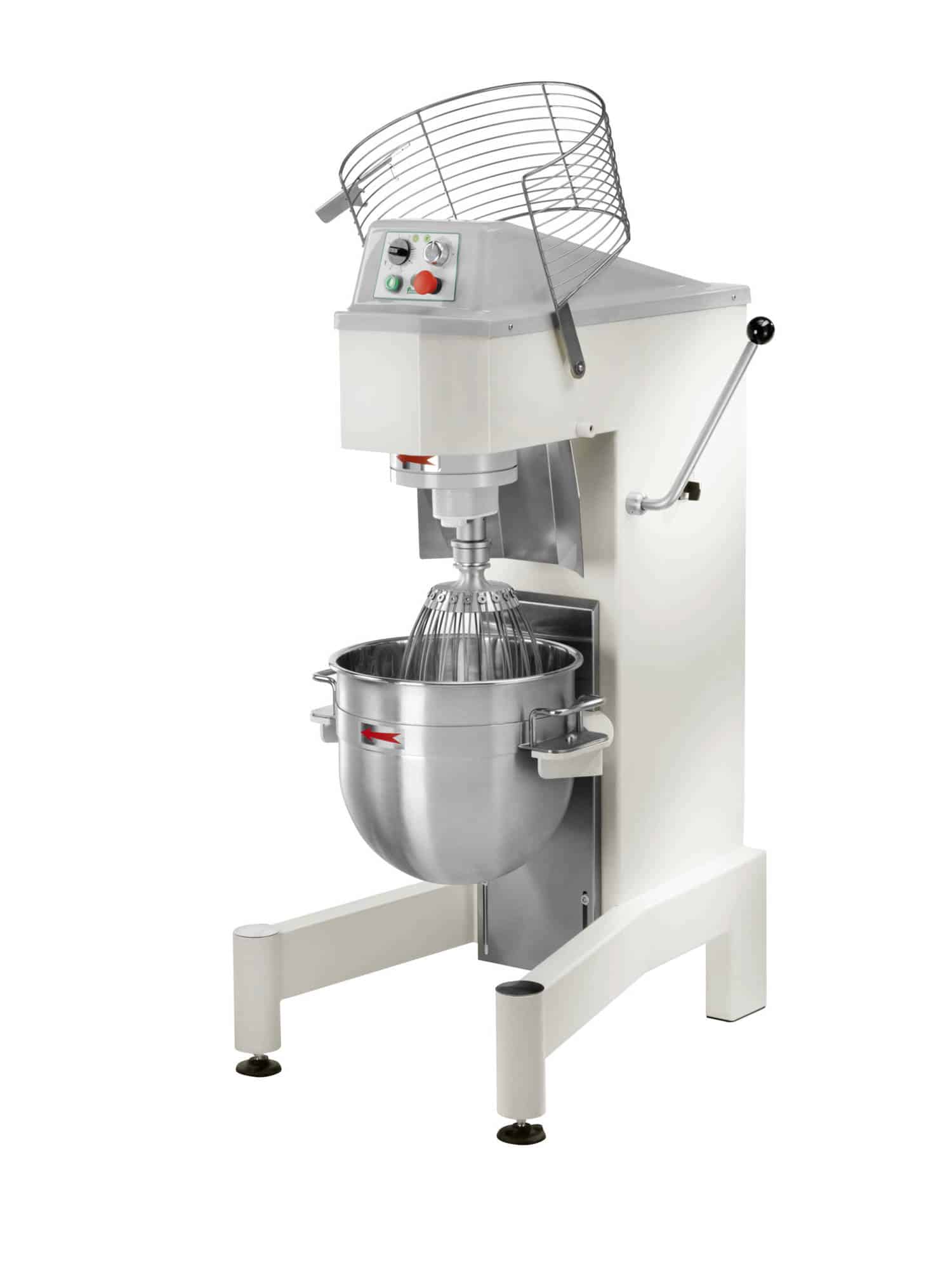 Mikser planetarny z regulatorem prędkości i sterowaniem mechanicznym oraz falownikiem. Maszyna do różnych rodzajów ciast, takich jak pizza, pieczywo, herbatniki, rogaliki, bułeczki, ptysie, biszkopty, ciasta kruche, bezy, przeciery, różne sosy, bita śmietana, itp. Rama pokryta farbą odporną na zarysowania – górna obudowa z ABS – miska, bicz i osłona miski ze stali nierdzewnej AISI 304 – hak i szpatułka z aluminium – mikroprzełącznik na misce i osłonie miski – wyjmowana misa – szybkie podłączenie narzędzia.