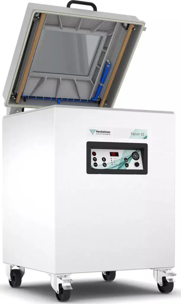 Sterowana elektronicznie pakowarka Falcon 52, wyposażona w dwie listwy o długości 520 mm, posiada pompę próżniową marki Busch o wydajności 63 m³/h, co umożliwia osiągnięcie próżni na poziomie 99,98%.
