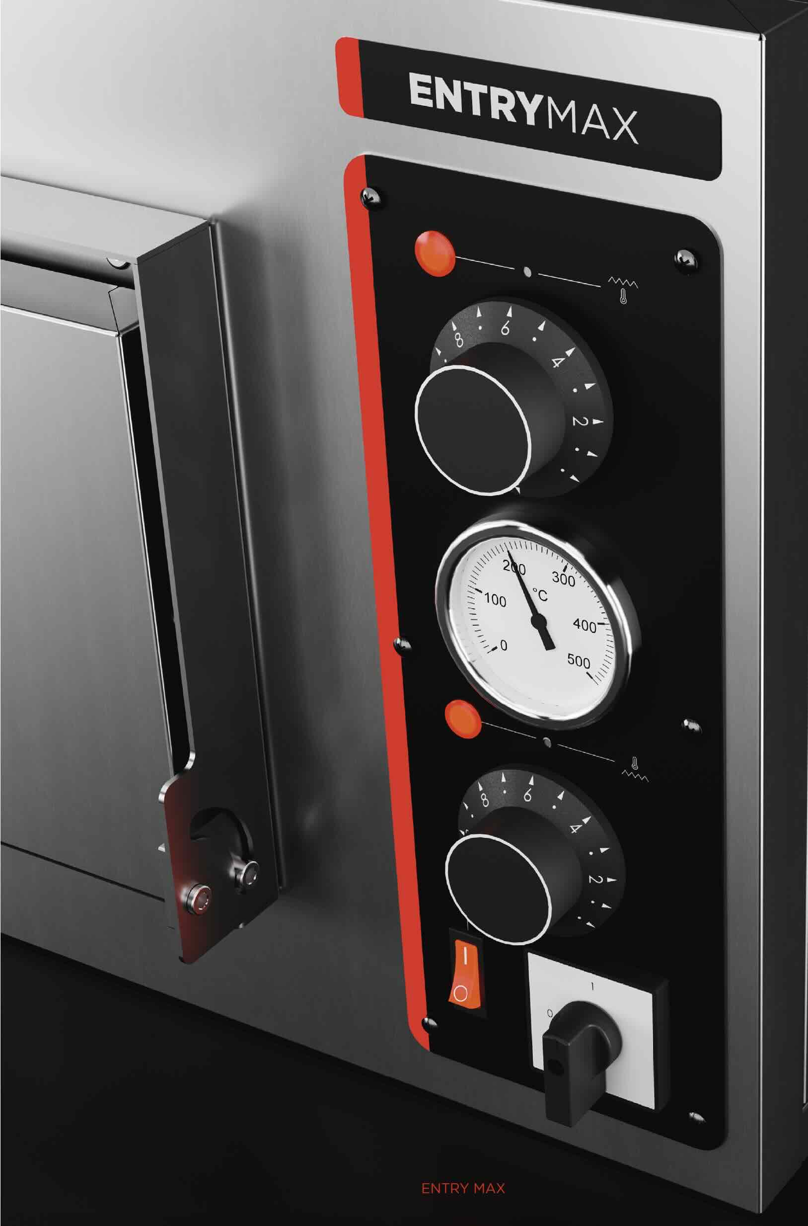 Cała linia Entry Max jest wykonana ze stali nierdzewnej i posiada podwójne szyby hartowane. Analogowy panel sterowania pozwala niezależnie regulować temperaturę górnej i dolnej części pieca, utrzymując równomierną temperaturę kamienia.