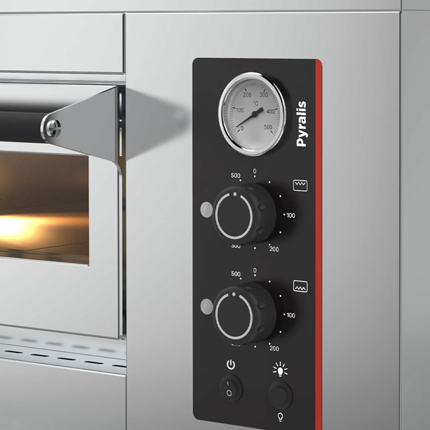 Linia Pyralis obejmuje elektryczne piece do pizzy o pojemności od 4 do 18 pizz o średnicy 33 cm, z manualnymi lub cyfrowymi panelami sterowania. Wszystkie modele mają wytrzymałą konstrukcję ze stali nierdzewnej, podwójnie szklane drzwi zapewniające optymalne zatrzymywanie ciepła oraz rączkę z szczotkowanej stali nierdzewnej, która nie nagrzewa się podczas użytkowania. W wersji cyfrowej system pozwala zapisać do 100 konfigurowalnych programów pieczenia, uporządkowanych według kategorii produktów i podzielonych na wiele etapów. Każda komora obsługuje do czterech niezależnych timerów, umożliwiając jednoczesne przygotowywanie różnych potraw z maksymalną wydajnością. Ustawienia temperatury można regulować w °C lub procentach mocy %, a tygodniowy harmonogram włączania/wyłączania automatyzuje zarządzanie energią. Tryby ECO i BOOST pozwalają dostosować wydajność do różnych wymagań serwisowych — zmniejszając zużycie energii w spokojniejszych okresach lub maksymalizując wydajność w godzinach szczytu. Wreszcie funkcja czyszczenia pirolitycznego zapewnia głęboką, łatwą higienę na koniec każdego dnia. Pizza Group Pyralis to więcej niż tylko piec do pizzy: to inteligentny partner, który upraszcza i wzbogaca każde doświadczenie kulinarne.