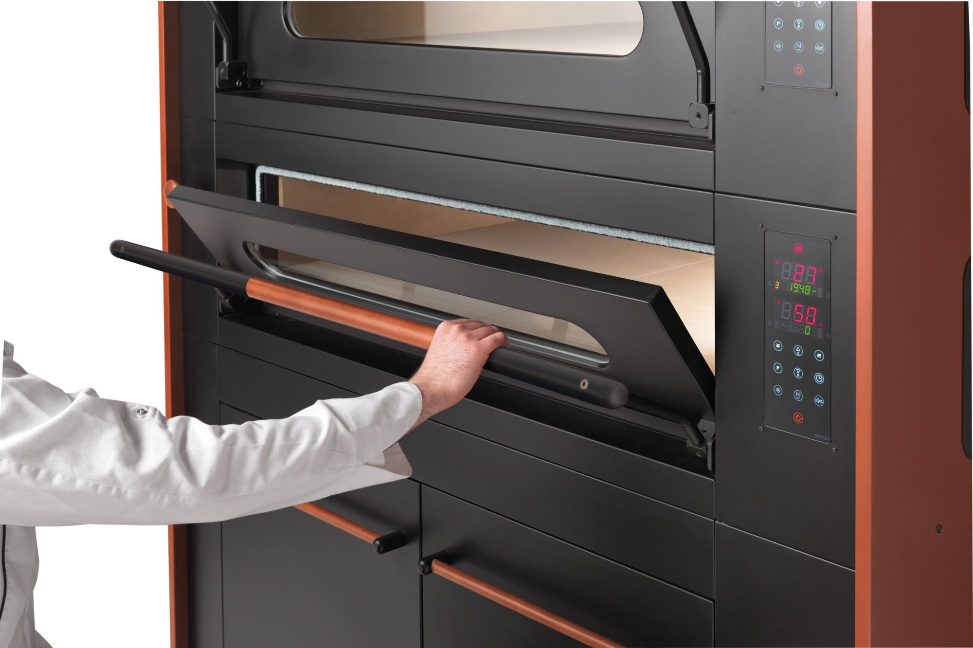 Piece do pizzy Italforni Visor dostępne są w wersji 1, 2 i 3 komór o pojemności 6 albo 9 pizz o średnicy 35 cm !, Piec posiada ergonomiczne, wyważone drzwi dla łatwości otwierania i zamykania które są przeszklone wysokiej jakości hartowanym szkłem zapewniającym pełny wgląd do komory pieca. Drzwi pieca zostały wyposażone w stalowo drewnianą atermiczną rączkę która oprócz designu zapewnia komfort poprzez fakt że nie nagrzewa się od temperatury pieca. Linia Visor została wyposażona w prosty i intuicyjny a zarazem nowoczesny dotykowy panel sterowania. Piece posiadają rozwiązanie redukujące wydostawaniu się ciepła w czasie w którym są otwarte drzwi komory. Funkcja odrębnej regulacji mocy górnych i dolnych elementów grzewczych. Komora pieca została całkowicie obudowana szamotem z elementami i grzewczymi wbudowanymi w dolnej płycie szamotowej dzięki czemu piec się szybciej nagrzewa i równomierniej rozprowadza temperaturę. Piece do pizzy i chleba Italforni Visor rozgrzewają do temperatury 450 stopni C. Piece są bardzo dobrze zaizolowane dzięki czemu średnie zużycie energii na godzinę to 50% mocy przyłączeniowej !