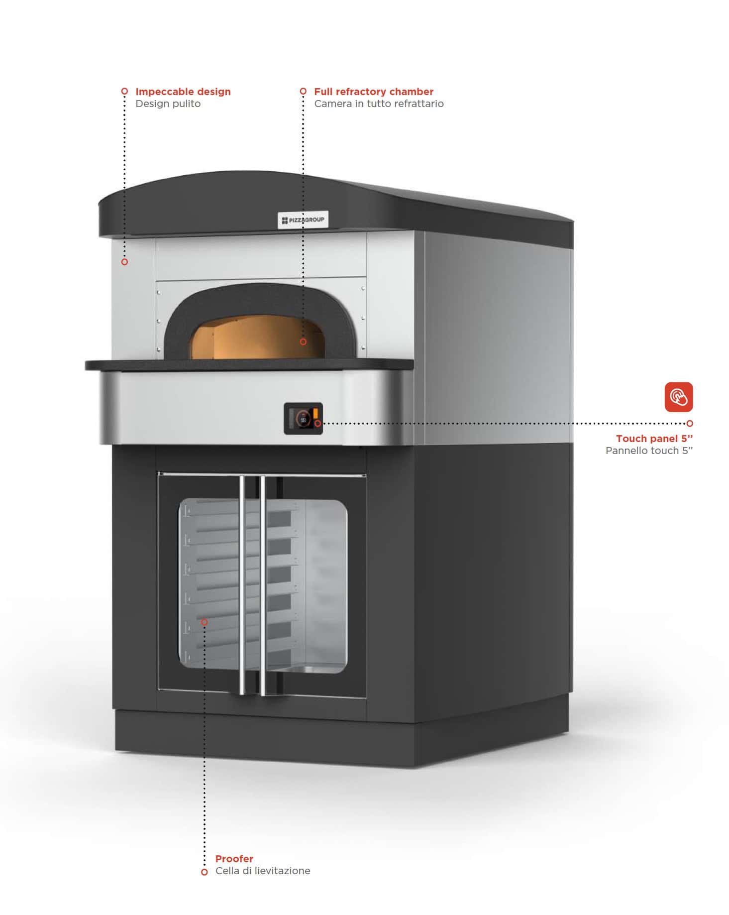 Elektryczny piec do pizzy Neapolitańskiej Pizza Group 550 został zaprojektowany specjalnie do przygotowywania słynnej pizzy w stylu neapolitańskim w zaledwie 90 sekund. Osiąga maksymalną temperaturę 550 °C w komorze pieczenia dzięki podłodze piekarnika złożonej z dwóch nakładających się kamieni, z których pierwszy poziom wykonany jest z charakterystycznej gliny Biscotto di Sorrento, a drugi poziom z Activestone czyli technologii szamotu z grzałkami zainstalowanymi w środku. Taka kompozycja zapewnia optymalne zatrzymywanie ciepła i zwiększa oszczędność energii. Pizza Group 550 posiada drzwi o wysokości 20 cm oraz mikroprocesor najnowszej generacji z panelem dotykowym i inteligentnym systemem zarządzania ciepłem, zapewniającym stałą kontrolę temperatury z przodu i z tyłu. Dzięki komorze garowniczej i innowacyjnym okapie wyciągowym, Pizza Group 550 jest idealnym rozwiązaniem dla kuchni każdego profesjonalisty.