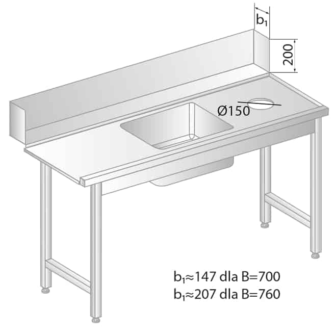 Stół załadowczy do zmywarek ze zlewem i otworem na odpadki wykonany jest ze stali nierdzewnej, o spawanej konstrukcji zapewniającej sztywność i wytrzymałość na równomiernie rozłożone obciążenia pionowe (do 2000 N) i boczne (do 1000 N). Stół wyposażony jest w: